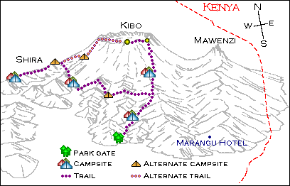 The trail continues across the plateau towards Kibo. After about 2 hours, the edge of the plateau is reached and the path climbs up for about 40 minutes to Shira hut at 3800 metres. Total time is about 3 hours, therefore, if the direct route is taken.