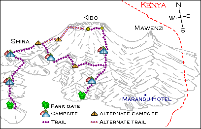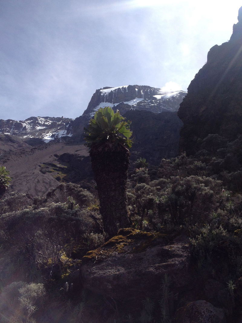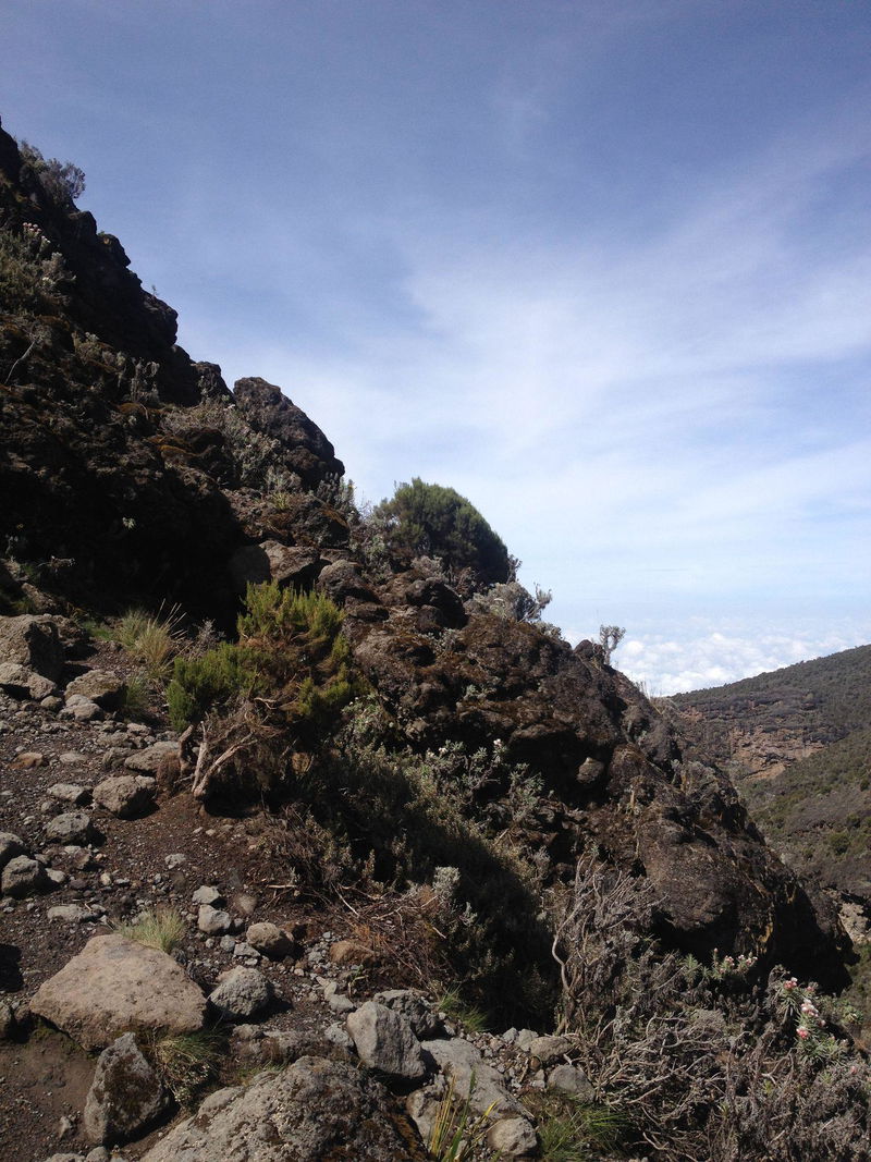 The path continues directly up the ridge towards Kibo. After about 4 hours, the path reaches Lava Tower, at the foot of the Great Western Breach.