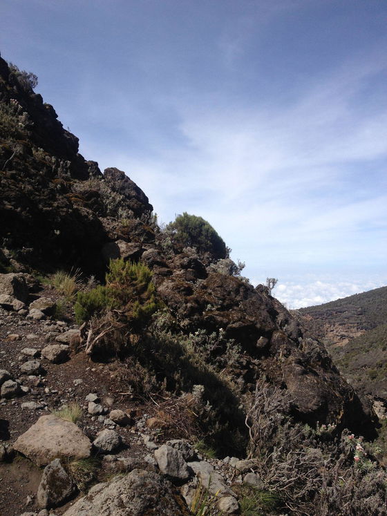 Then, after about 4 hours, the path turns left, flattening out into a gorge and ascending more gradually to Shira camp at 3840 metres on the Shira plateau to the west of Kibo. Total time is about 5-6 hours.